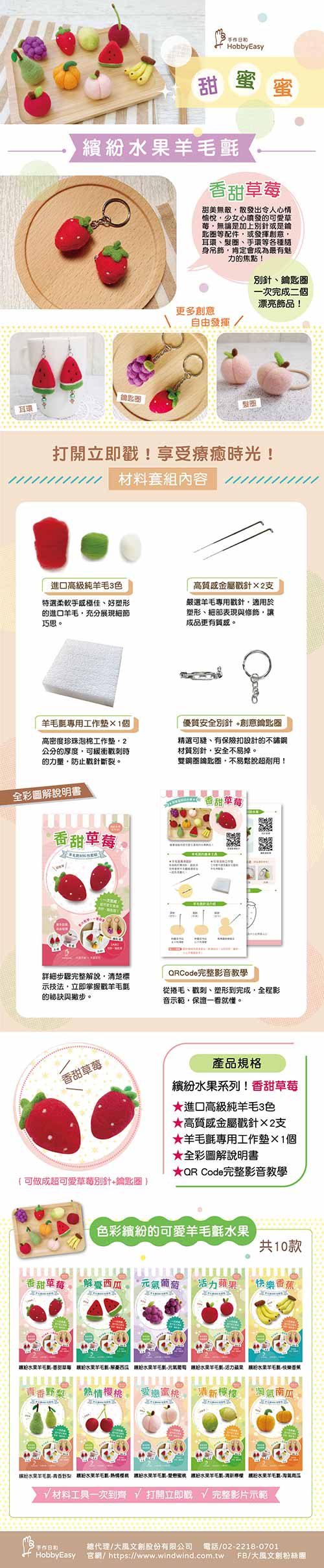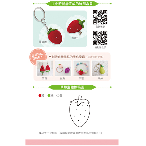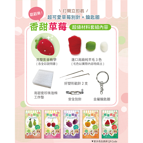 甜蜜蜜!色彩繽紛的可愛羊毛氈水果 【香甜草莓】超值全材料包套組 別針、鑰匙圈,一次完成二個漂亮飾品! 材料工具一次到齊,打開立即享受戳戳樂, 完整影音教學,詳細彩色圖解,新手也能開始一次學會!