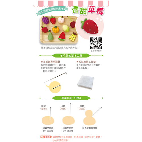 全彩圖解說明書 ◎甜蜜蜜的繽紛水果 ——香甜草莓 ◎羊毛氈工具介紹 ◎羊毛氈針法介紹 ◎別針、鑰匙圈縫製教學(附完整影片教學QR Code) ◎線稿主圖