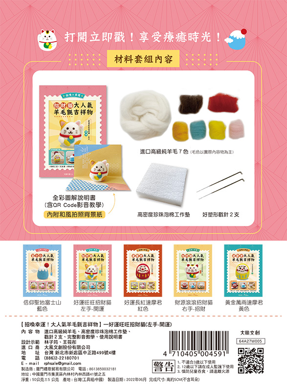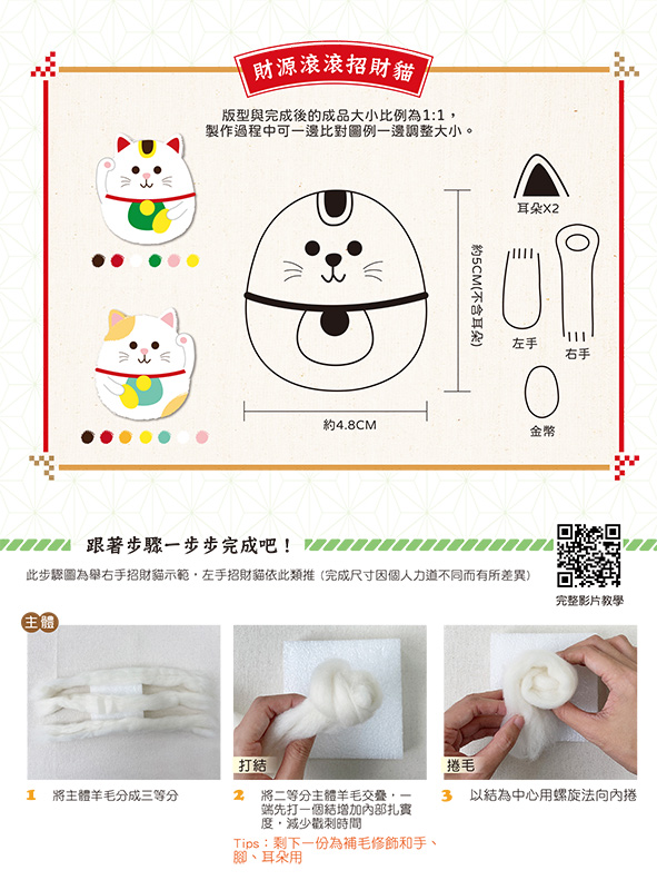 商品特色: 【羊毛氈超值全材料包套組——好運旺旺招財貓】(完成尺寸:約5公分) 專為初學者量身打造的羊毛氈體驗組,內含完整的材料及工具,以及QRCode全程示範影音教學,一打開就能立即享受DIY手作樂趣!