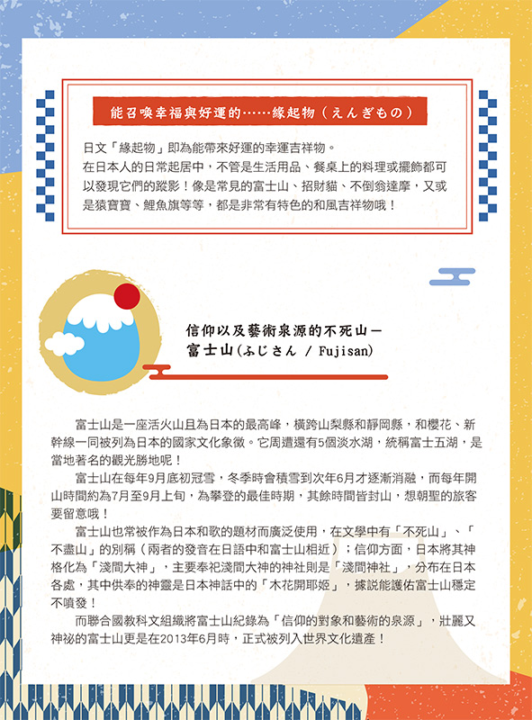 ◎能招喚幸福與好運的緣起物 信仰以及藝術泉源的不死山——富士山 財運、福氣、善緣的守護神——招財貓 百推不倒,願望達成——達摩