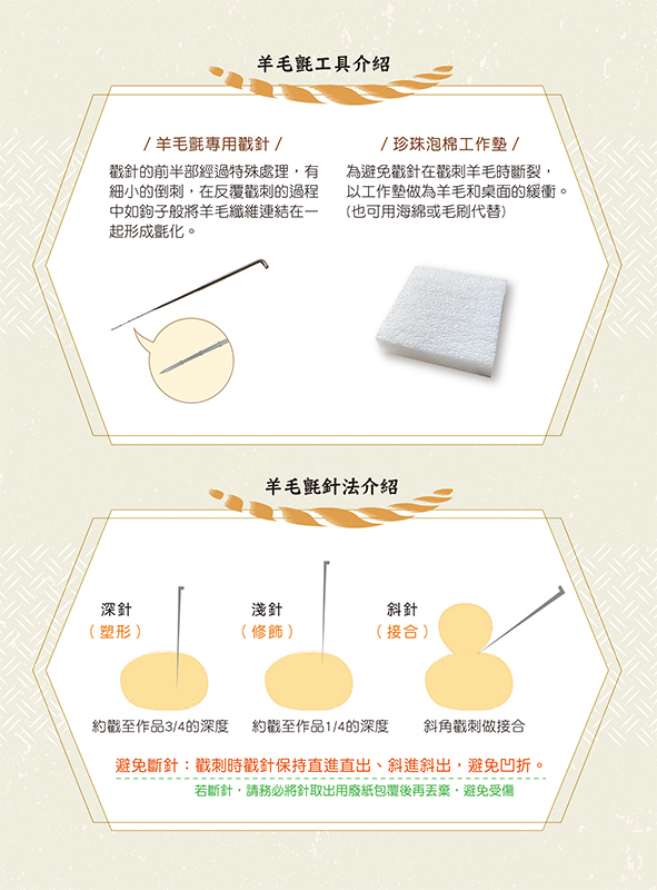 ◆ 進口高級純羊毛 特選柔軟手感極佳、好塑形的進口羊毛,柔軟又療癒的充分展現細節巧思。 ◆ 高質感金屬戳針×2支 嚴選羊毛專用戳針,適用於塑形、細部表現與修飾作業結合,讓你的吉祥物更生動。 ◆ 羊毛氈專用工作墊×1個 高密度珍珠泡棉工作墊,2公分的厚度,可緩衝戳刺時的力量,防止戳針斷裂。 ◆ 全彩圖解說明書×1份 詳細步驟完整解說,清楚標示技法,立即掌握戳羊毛氈的祕訣與撇步。 ◆ QRCode完整影音教學 從捲毛、戳刺、塑型到完成,全程影音示範,保證一看就懂。