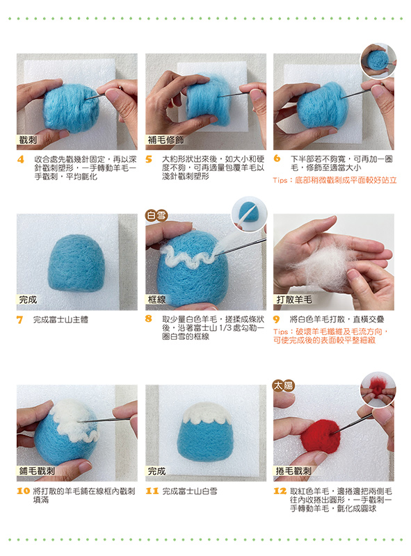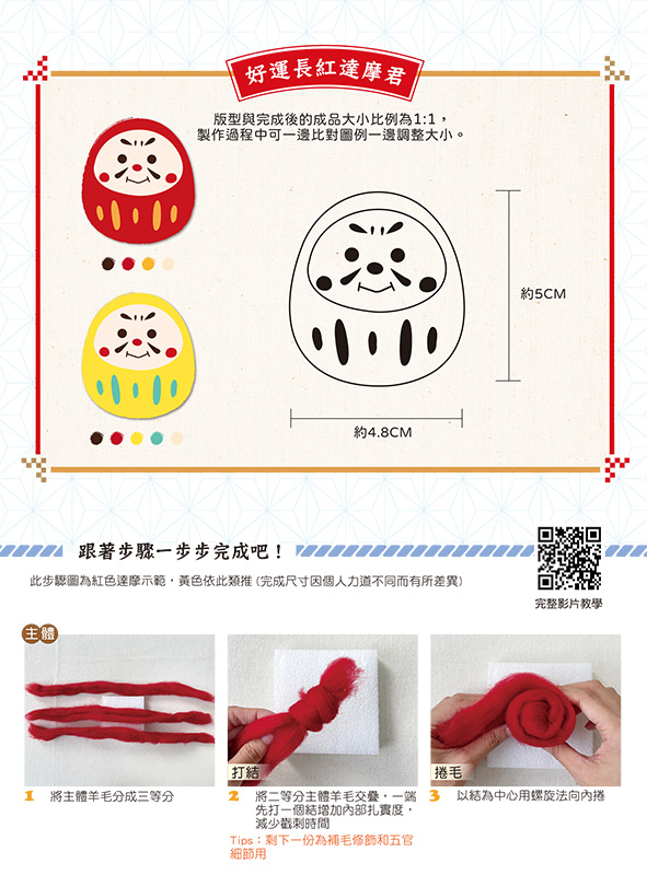 ★一學就會!詳細步驟圖解×QR Code影音教學 從富士山、招財貓、達摩成為吉祥物的小知識,再到超清楚步驟圖解,搭配隨掃隨看的完整影音教學,一動一靜雙效學習,更能掌握技法訣竅,即使是第一次嘗試羊毛氈也沒問題!