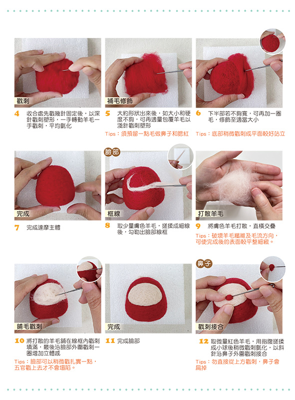 ★完整呈現!原寸大小圖示對照 擔心羊毛氈比例抓不準?書中附實物大小紙型,製作時只要按圖操作,就能把形狀戳刺得很漂亮,羊毛氈新手也能不NG!