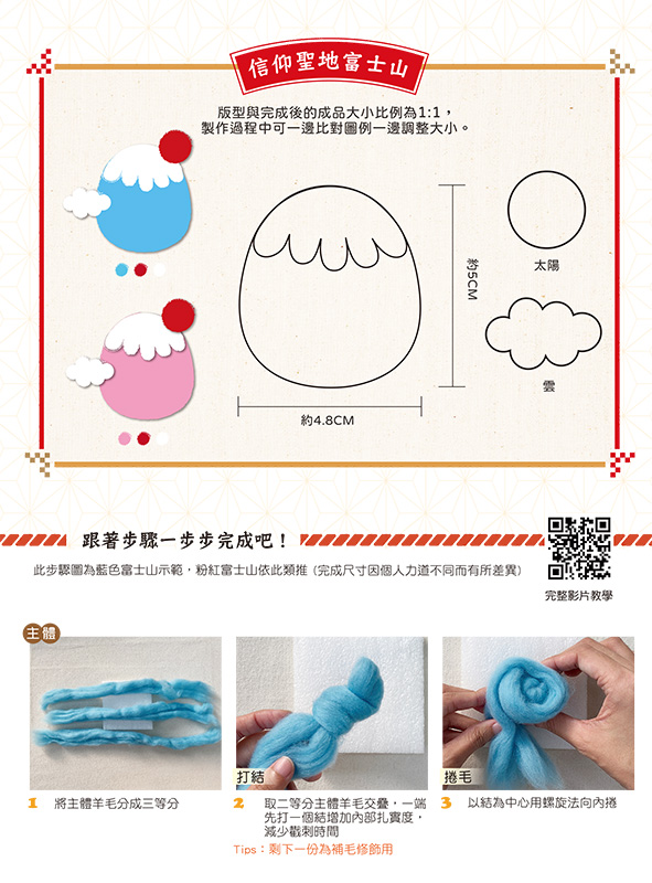 ◎好運長紅達摩君——作法教學(附完整影片教學QR Code) 版型&步驟 ◎財源滾滾招財貓——作法教學(附完整影片教學QR Code) 版型&步驟 ◎信仰聖地富士山——作法教學(附完整影片教學QR Code) 版型&步驟 ◎拍照背景紙