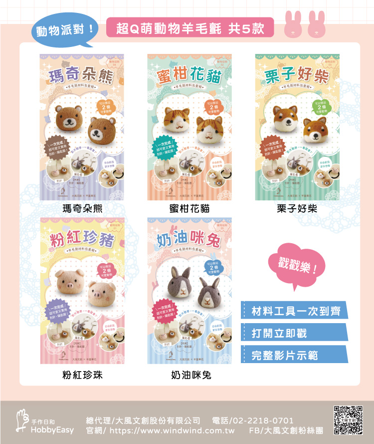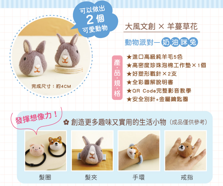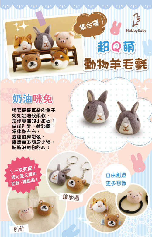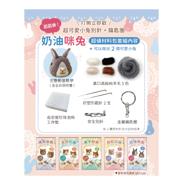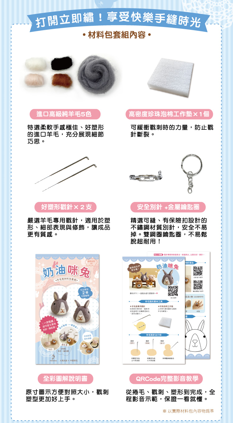集合囉!超Q萌動物羊毛氈 【奶油咪兔】超值全材料包套組 別針、鑰匙圈,一次完成二個可愛夥伴! 材料工具一次到齊,打開立即享受戳戳樂, 完整影音教學,詳細彩色圖解,新手也能一次學會!