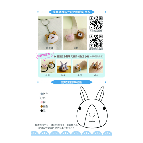 一、全彩圖解說明書 ◎集合囉!動物朋友們 ——奶油咪兔 ◎羊毛氈工具介紹 ◎羊毛氈針法介紹 ◎別針、鑰匙圈縫製教學(附完整影片教學QR Code) ◎線稿主圖