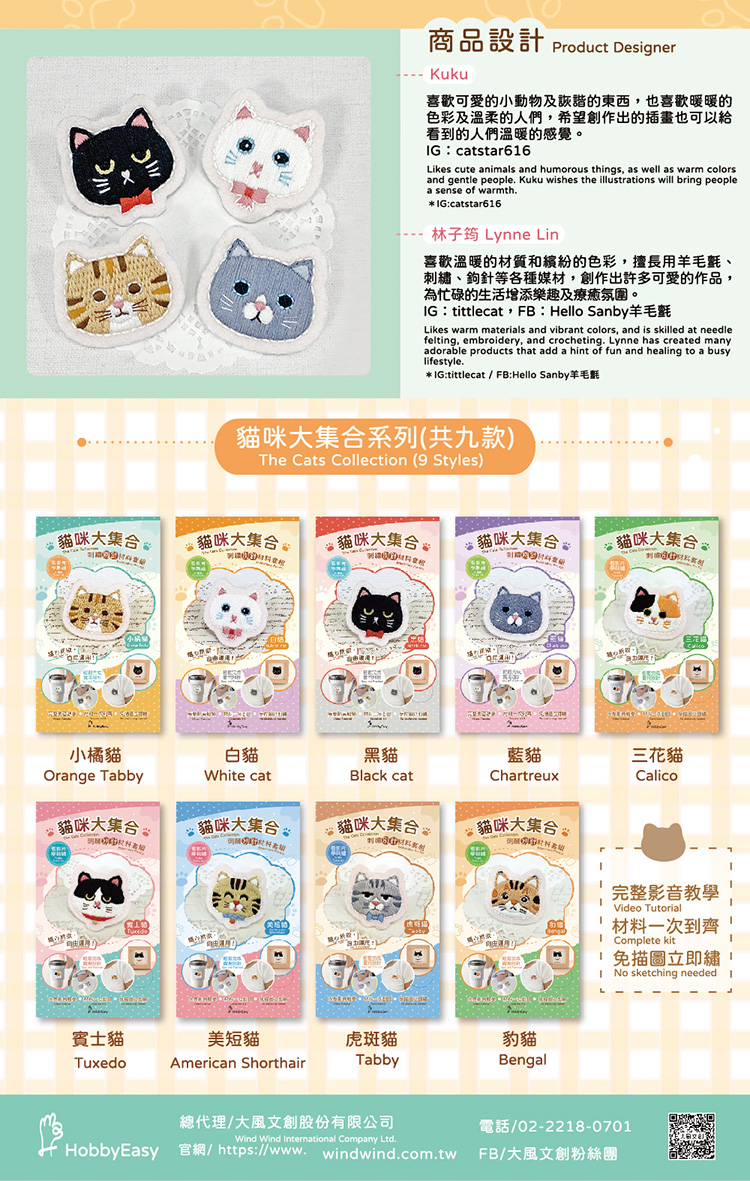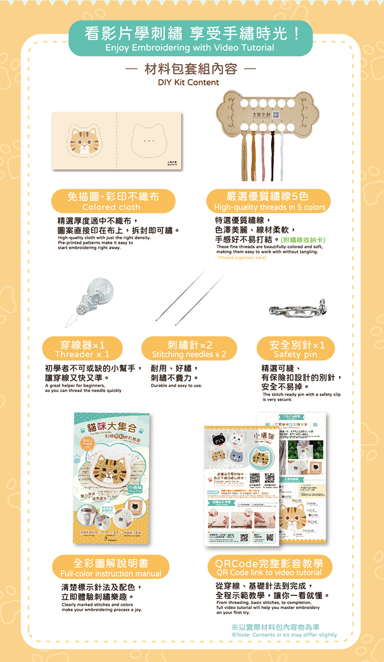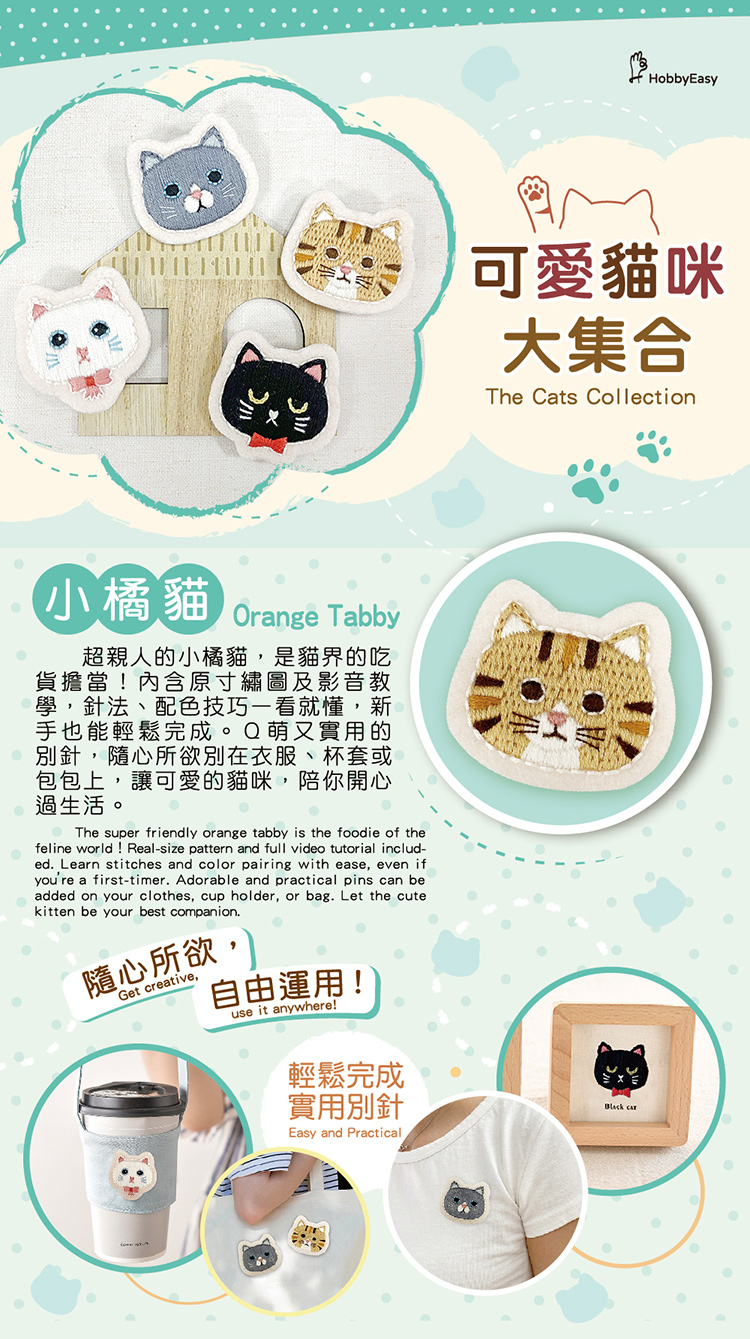 【HobbyEasy】貓咪大集合刺繡材料包套組:小橘貓(附別針,含全程影音教學)