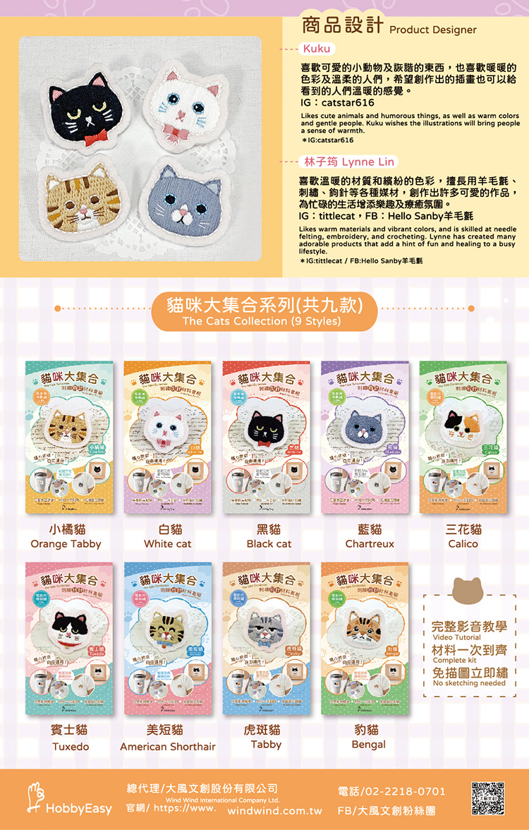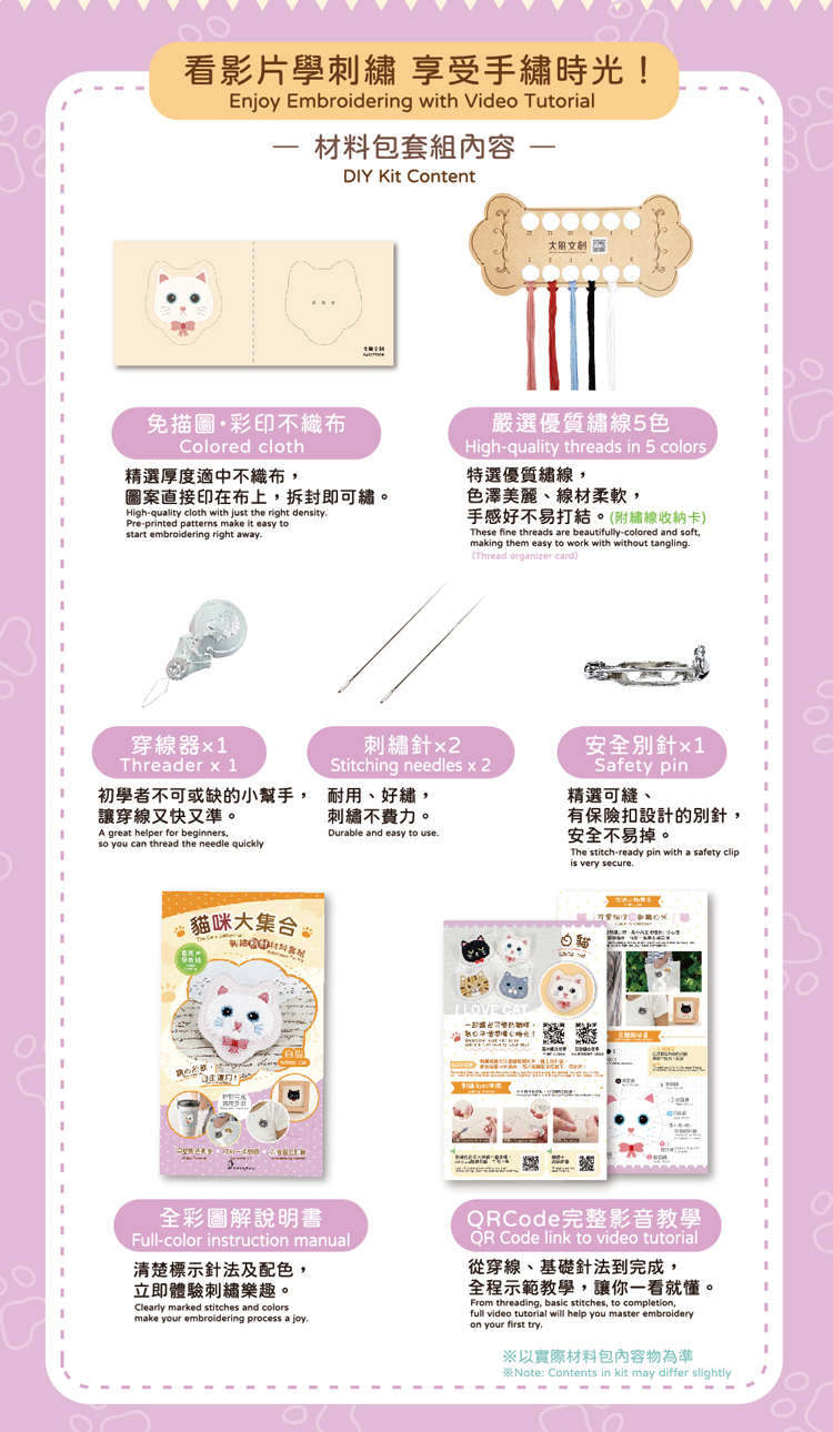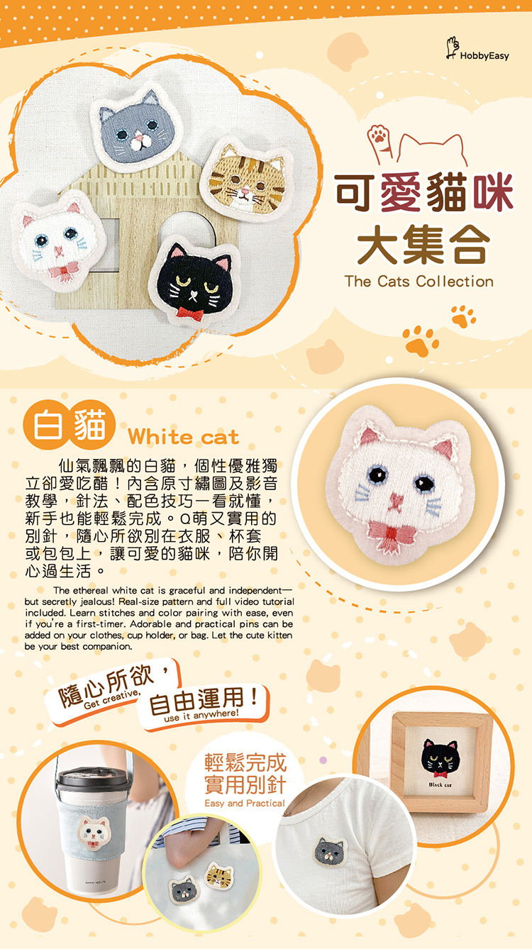 【HobbyEasy】貓咪大集合刺繡材料包套組:白貓(附別針,含全程影音教學)