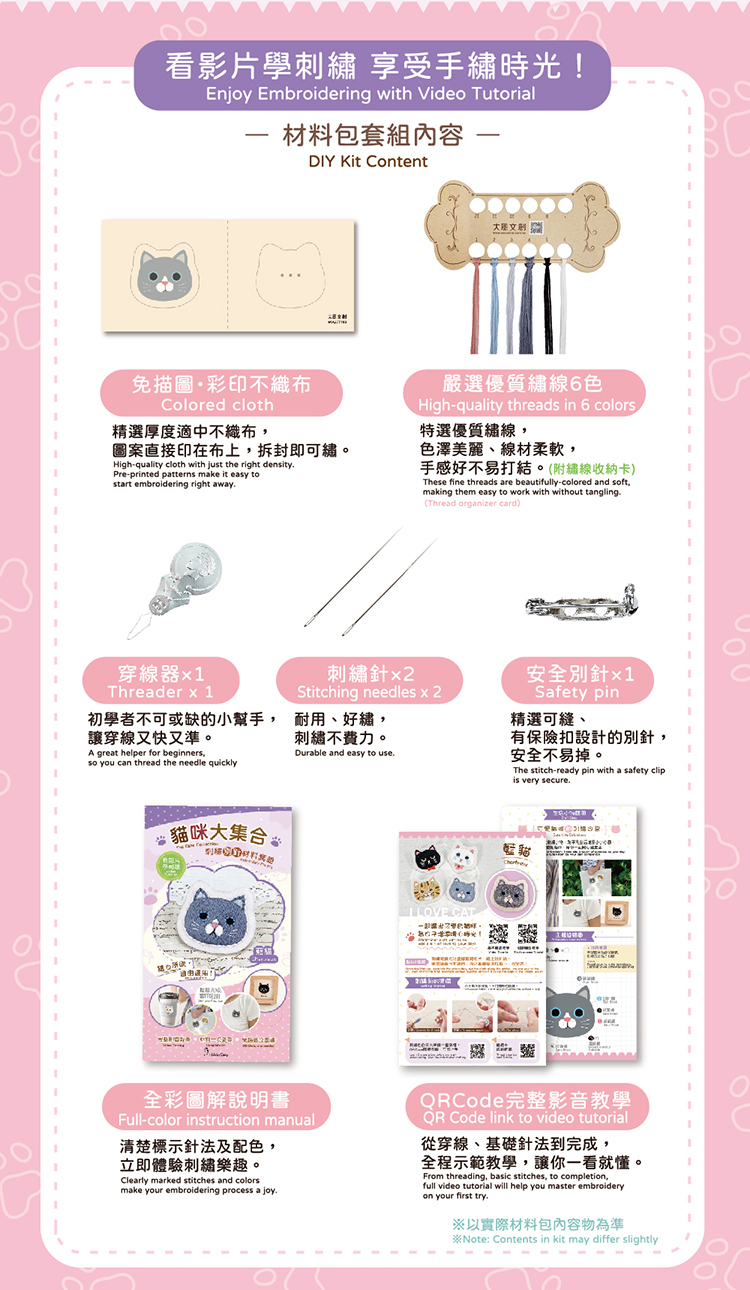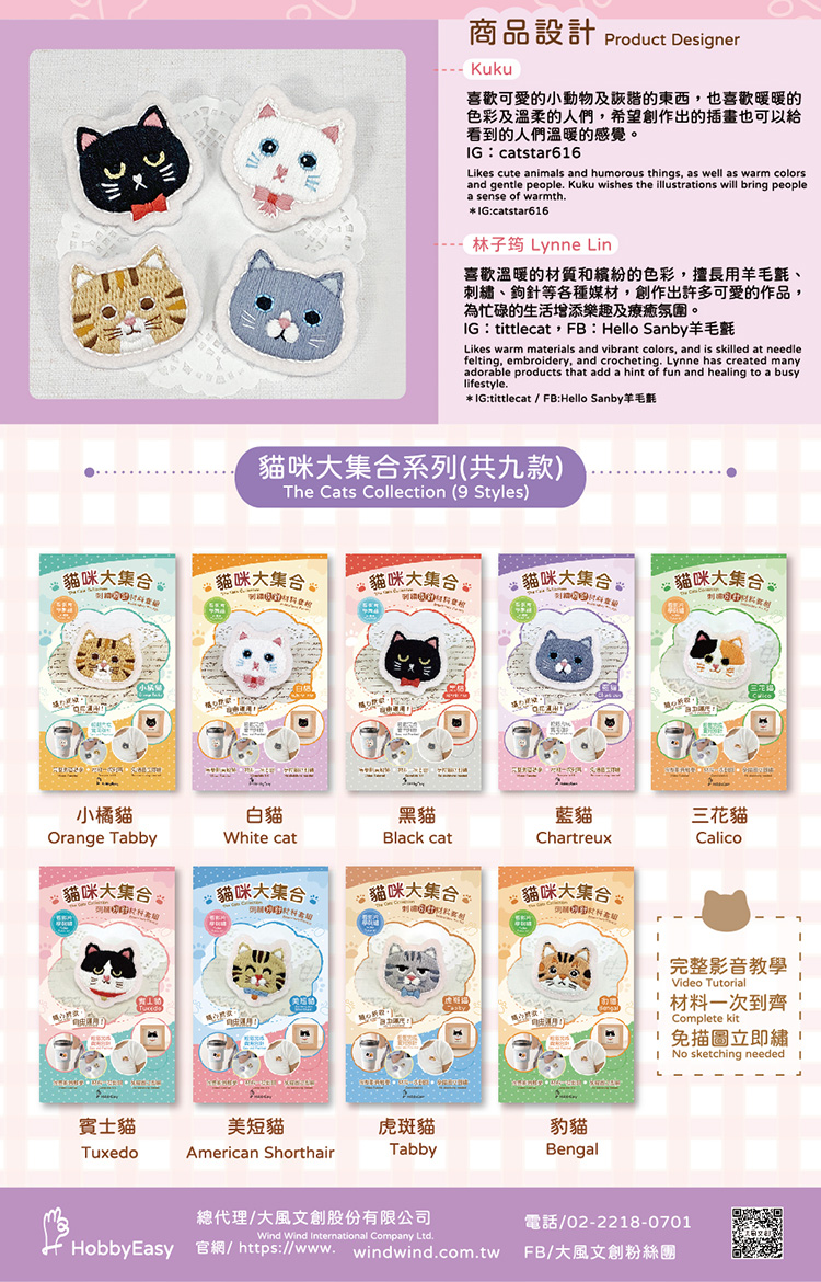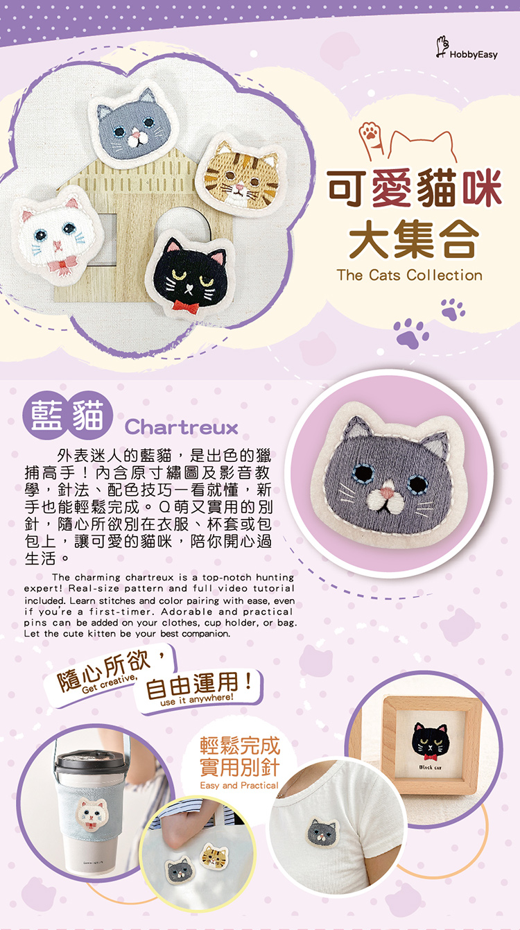 【HobbyEasy】貓咪大集合刺繡材料包套組:藍貓(附別針,含全程影音教學)